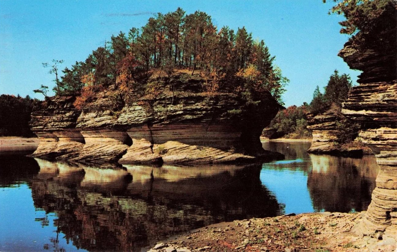 Noted for its gorges, tributary canyons and sandstone rock formations, the Dells of the Wisconsin River extend eight kilometers and are a favorite among locals and visitors. At certain points along the water’s edge, the cliffs rise 30 meters above the river, eroded from years of water and wind beating against the rock.