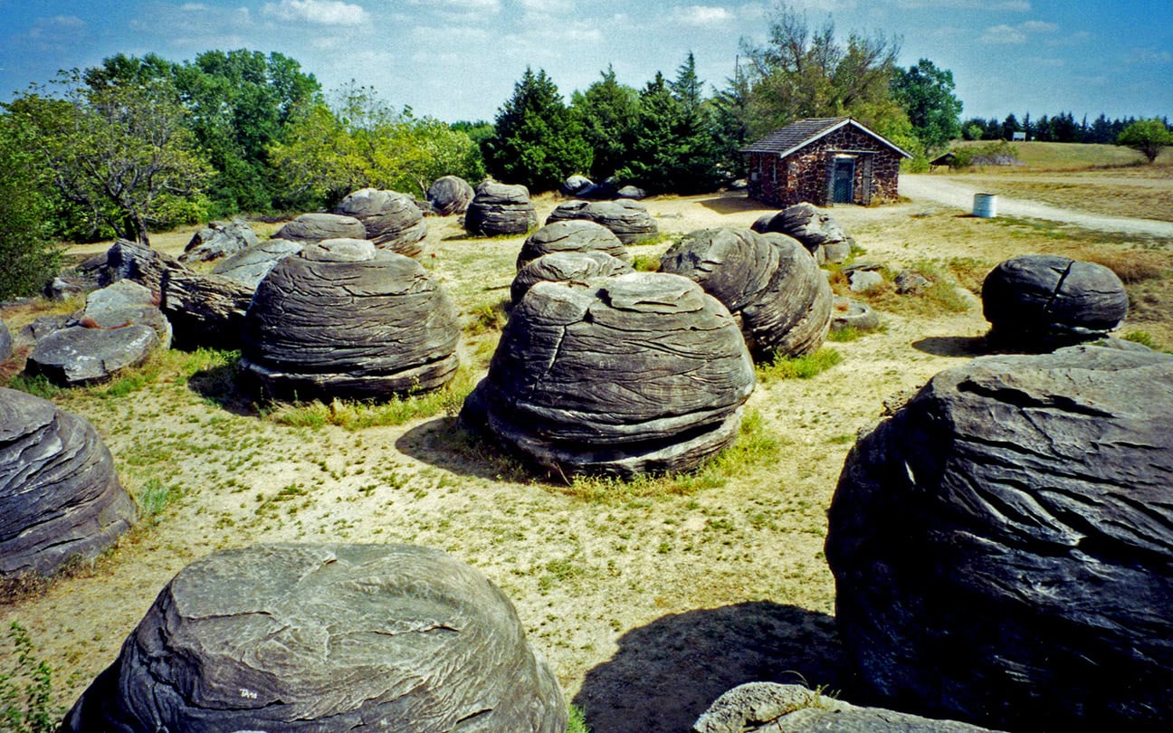 Made from giant calcite-cemented rock structures, Rock City contains a total of 200 spherical boulders ranging from 3 to 6 meters in diameter. This geological anomaly occupies a flat Kansas prairie.