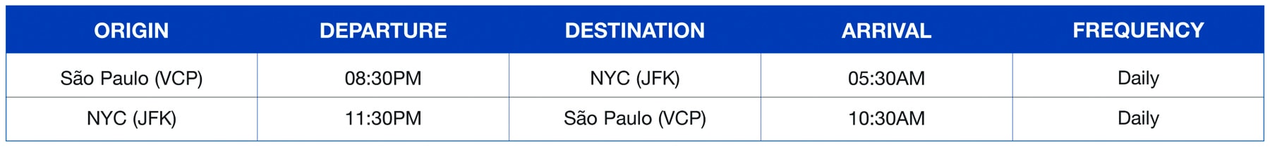 The flight will operate from the international terminal at São Paulo-Viracopos airport and, at JFK, it will operate at JetBlue’s Terminal T5. The flights are timed to offer quick and convenient connections to important destinations such as Boston in the U.S. and Rio de Janeiro in Brazil.