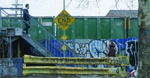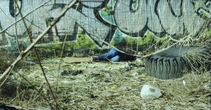 de uma pilha de seringas de heroína usadas espalhadas pelo chão de uma ferrovia abandonada, enfatizando o fato de que muitos usuários vão exatamente para esse local em busca de um desapego sintético para se livrarem dos sintomas debilitantes da dopesickness.
