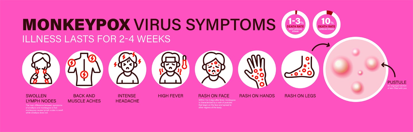 Unlike SARS-CoV-2, which spreads through tiny air-borne droplets called aerosols, monkeypox is thought to spread from close contact with bodily fluids, such as saliva from coughing. That means a person with monkeypox is likely to infect far fewer close contacts than someone with SARS-CoV-2, Hooper says. Both viruses can cause flu-like symptoms, but monkeypox also triggers enlarged lymph nodes and, eventually, distinctive fluid-filled lesions on the face, hands and feet. Most people recover from monkeypox in a few weeks without treatment.